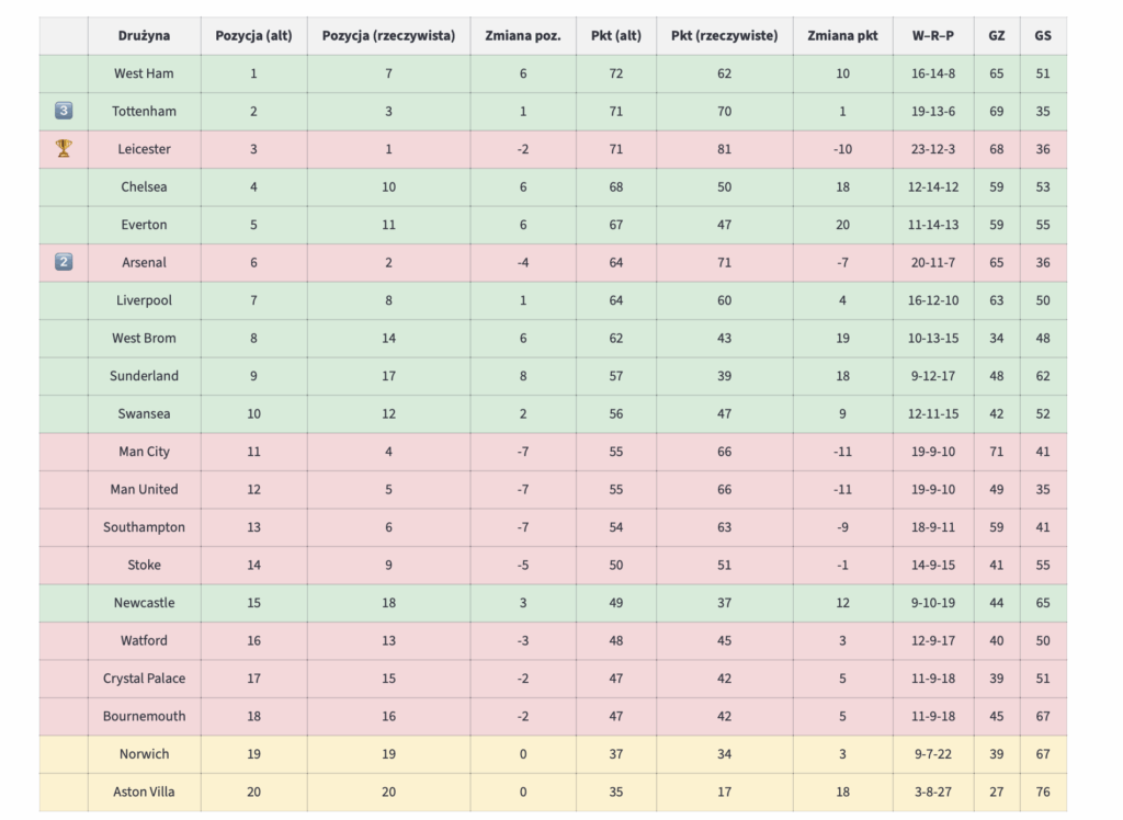 To jak zdecydowanie Leicester wygrało ligę w sezonie 15/16 uświadamia dopiero chwila zabawy z naszym kalkulatorem punktacji alternatywnych. W systemie standardowym 3-1-0, Lisy wyprzedziły drugi Arsenal o 10 punktów i trzeci Tottenham o 11. Okazuje się, że żaden system, w którym wygrana jest warta więcej niż remis, a remis więcej niż porażka (tzn. zachowujący tzw. monotoniczność punktacji względem wyniku) nie doprowadza do zmiany mistrza. Systemy 2-1-0, 3-2-1, 1-0-(-1) – absolutnie nic nie jest w stanie odebrać Lisom tytułu. Da się to zresztą udowodnić matematycznie. Zainteresowanych i niezdrowo szurniętych na punkcie cyferek czytelników, podobnie jak autor tego tekstu, zapraszamy do kontaktu.